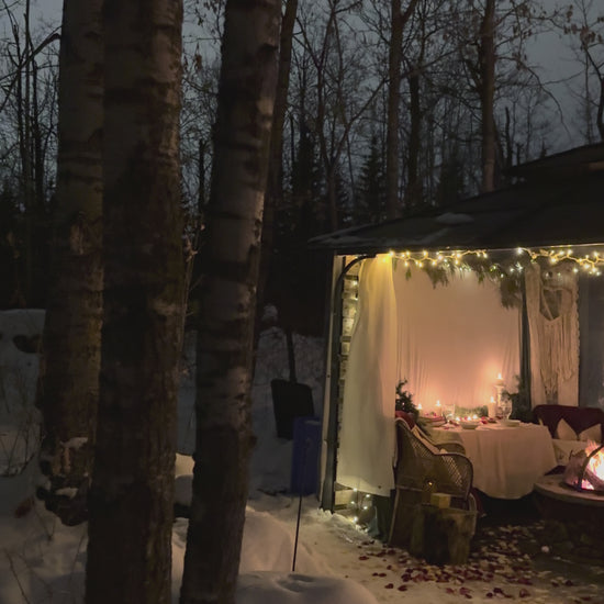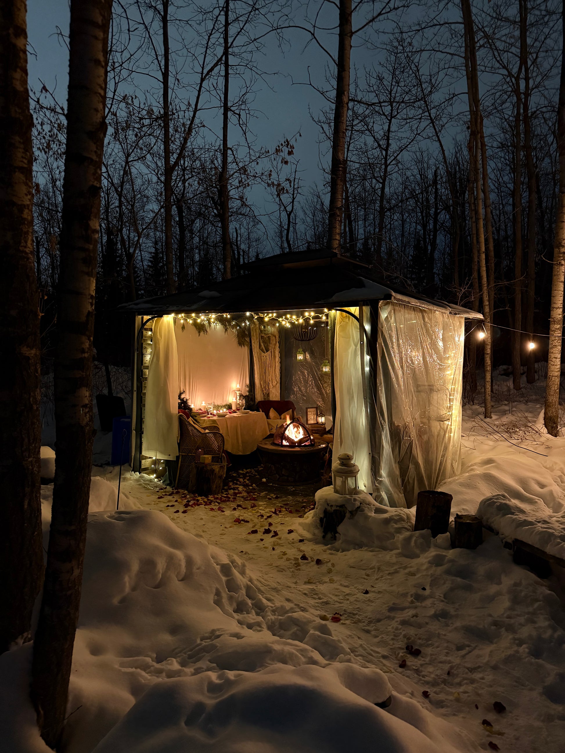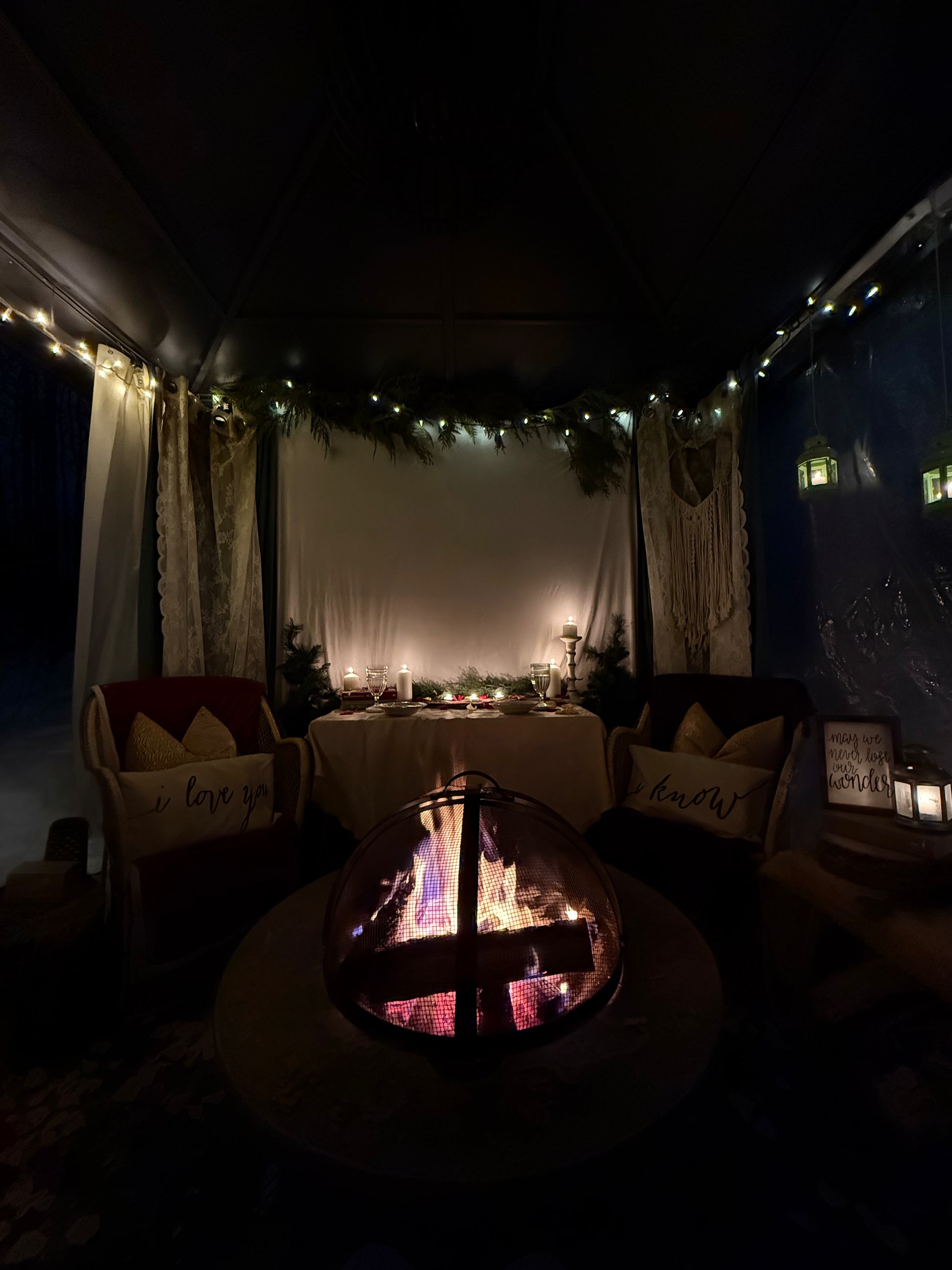 Your Movie Night Picnic takes place in a covered gazebo with a private firepit, cozy seating, and blankets—giving you a warm, intimate setting in the heart of the forest. Watch your favorite movie on your personal outdoor projector screen while snuggled up inside the gazebo, surrounded by flickering candles, soft décor, and cozy touches.