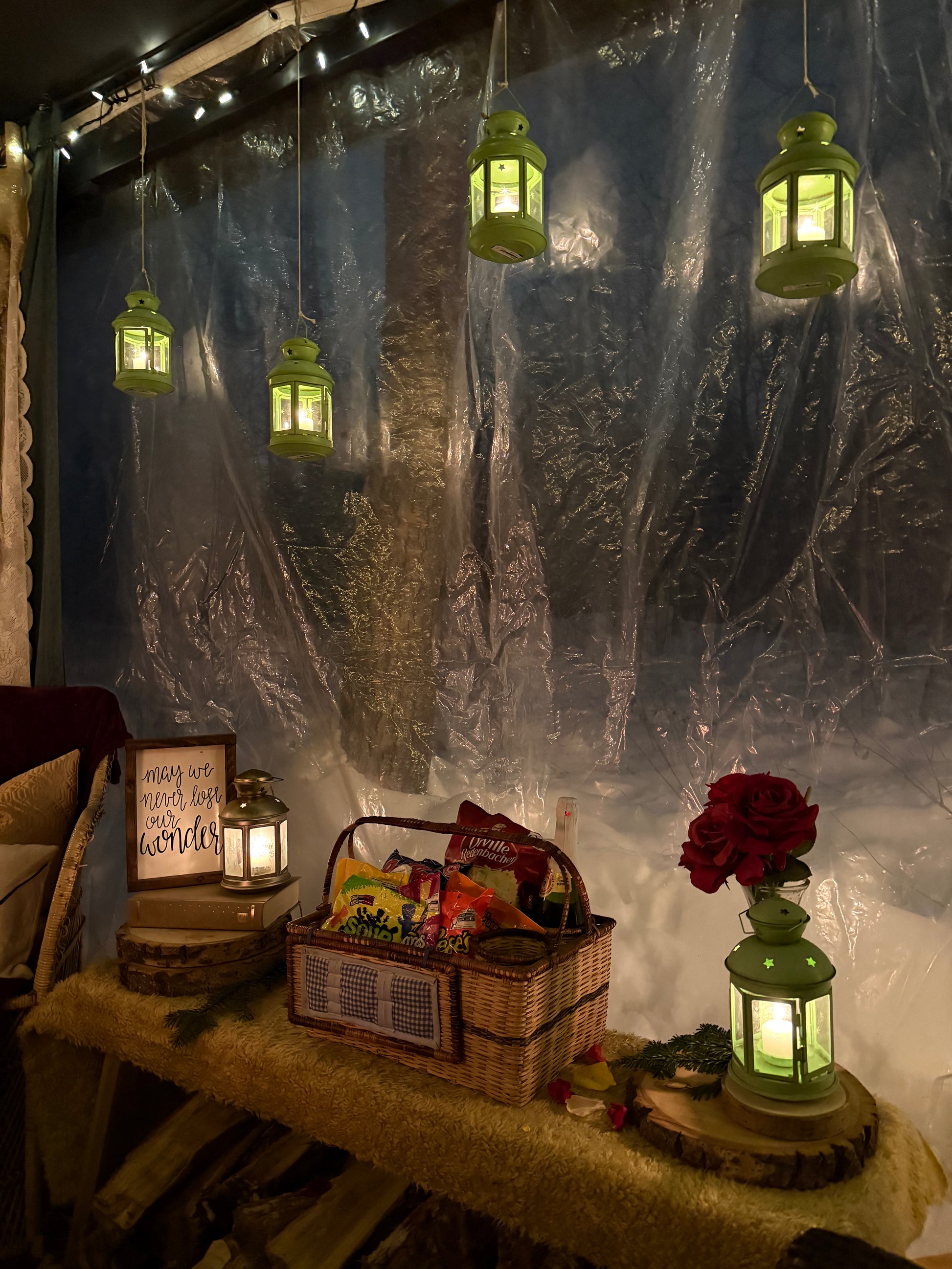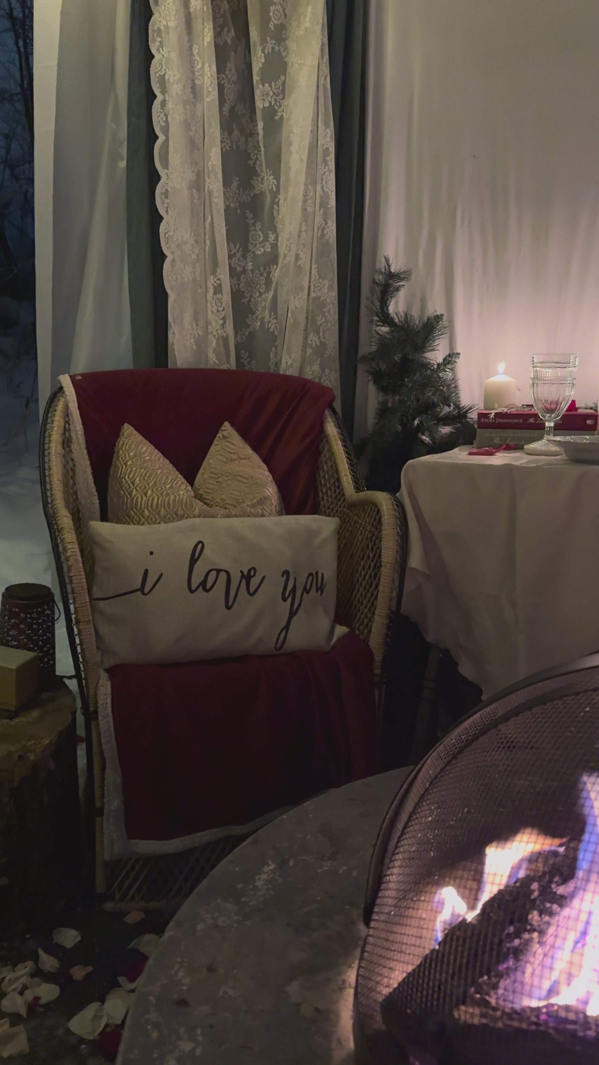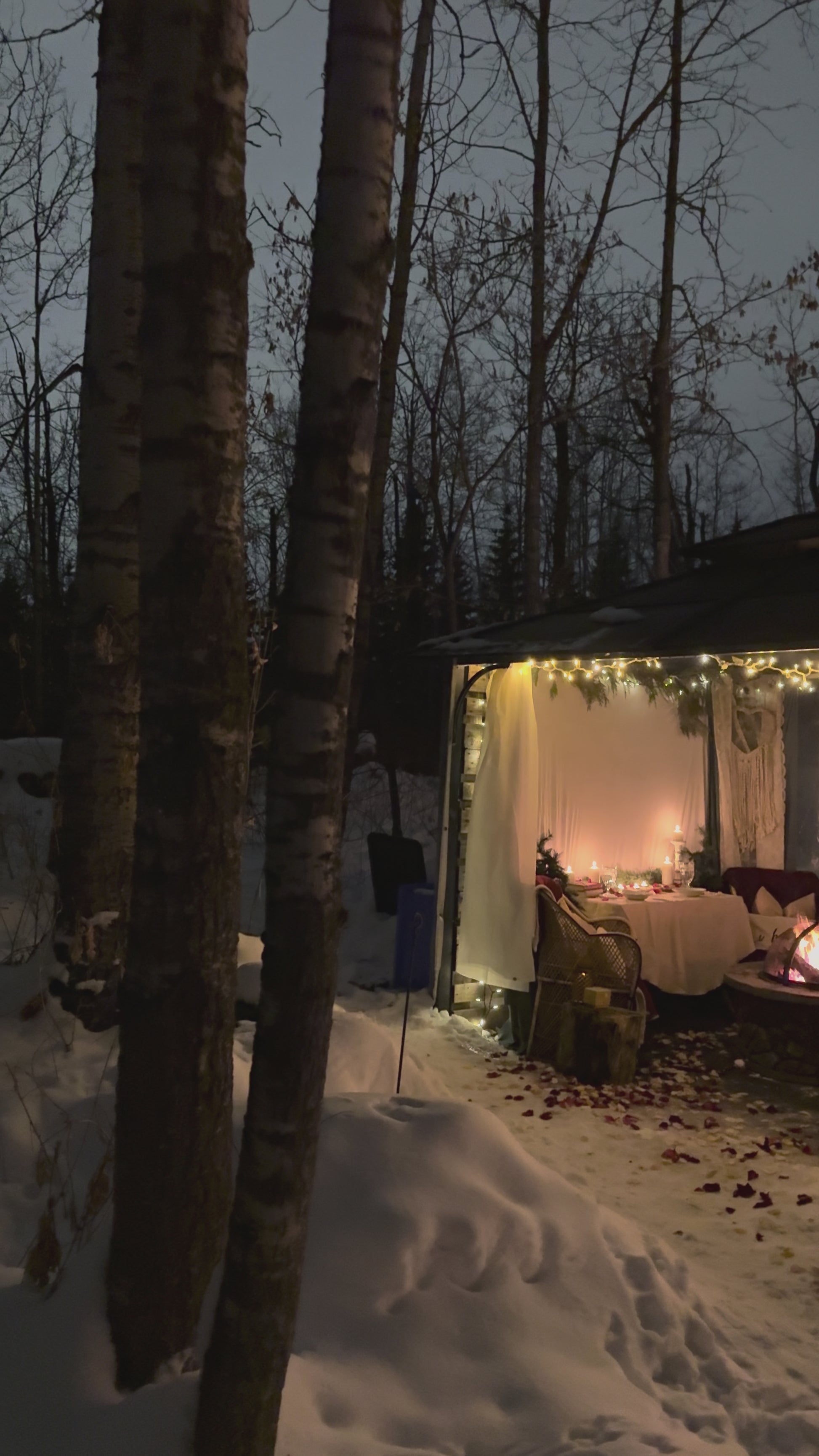 Your Movie Night Picnic takes place in a covered gazebo with a private firepit, cozy seating, and blankets—giving you a warm, intimate setting in the heart of the forest. Watch your favorite movie on your personal outdoor projector screen while snuggled up inside the gazebo, surrounded by flickering candles, soft décor, and cozy touches.